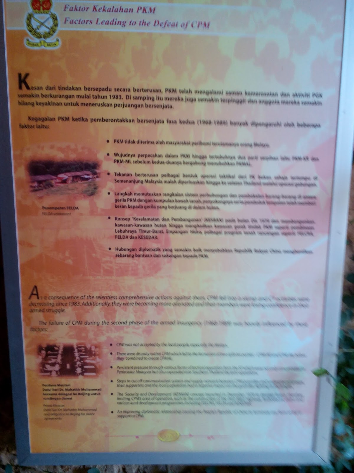 Muzium tentera darat di Port Dickson merupakan sebuah muzium yang percuma. Semua orang boleh masuk melawat dan melihatkan sejarah tentera darat di Malaysia dari permulaan pertubuhannya sehingga ke masa kini. Merupakan satu tempat yang amat berinformasi. Sekiranya diteliti dan dibaca habis semua maklumat yang dipaparkan, saya rasa perlukan 1 hari. Kalau sekadar jalan-jalan ambil gambar macam saya, lebih kurang dalam 2 - 3 jam sudah cukup. Satu tempat yang memang berbaloi untuk melawat.
